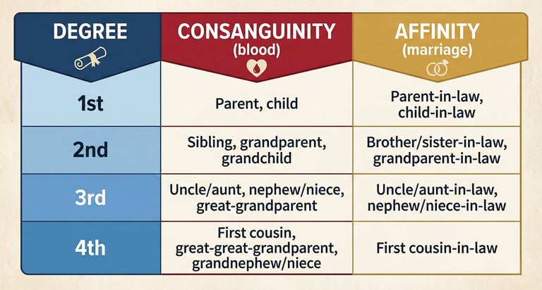 The bill limits the ban to the second degree of consanguinity and affinity. That means parents, children, siblings, grandparents, grandchildren, and spouses. It does not touch uncles, aunts, nephews, nieces, or first cousins.