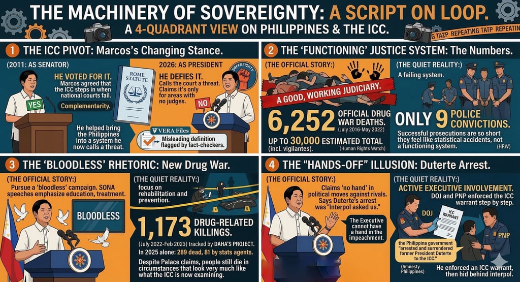 It sits on his 2011 yes‑vote to the Rome Statute. It sits on repeated mischaracterizations of what the ICC is for. It sits on a domestic record where thousands were killed and around nine officers were convicted. It sits on a “new” drug policy that still leads to deaths on the ground. It sits on a habit of denying involvement while his allies and institutions move in his favor. It sits on a decision to enforce an ICC warrant on Duterte while insisting the court has no authority here. And it sits against calls from people like Pimentel to use ICC membership as a safeguard for the future, which he has declined.