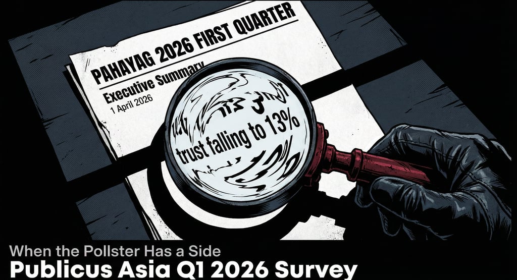 The Publicus Asia Q1 2026 survey dropped on April 1, 2026, showing both President Marcos and VP Sara Duterte posting significant declines in approval and trust ratings. But the numbers are only half the story — the methodology, the timing, and the person behind the instrument raise questions that the headline figures alone cannot answer. This piece breaks down what the Publicus Asia Q1 2026 survey actually measured, what it missed, and why it matters for 2028.